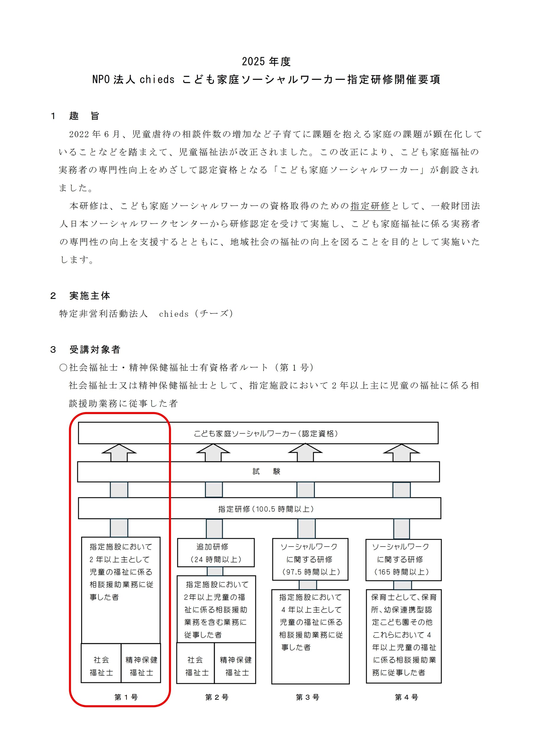 この度、特定非営利活動法人chiedsは「こども家庭ソーシャルワーカー 認定資格」の研修実施機関として一般財団法人 日本ソーシャルワークセンターに正式に認定され、指定研修を実施することとなりました。(認定番号:2025-1-27)
