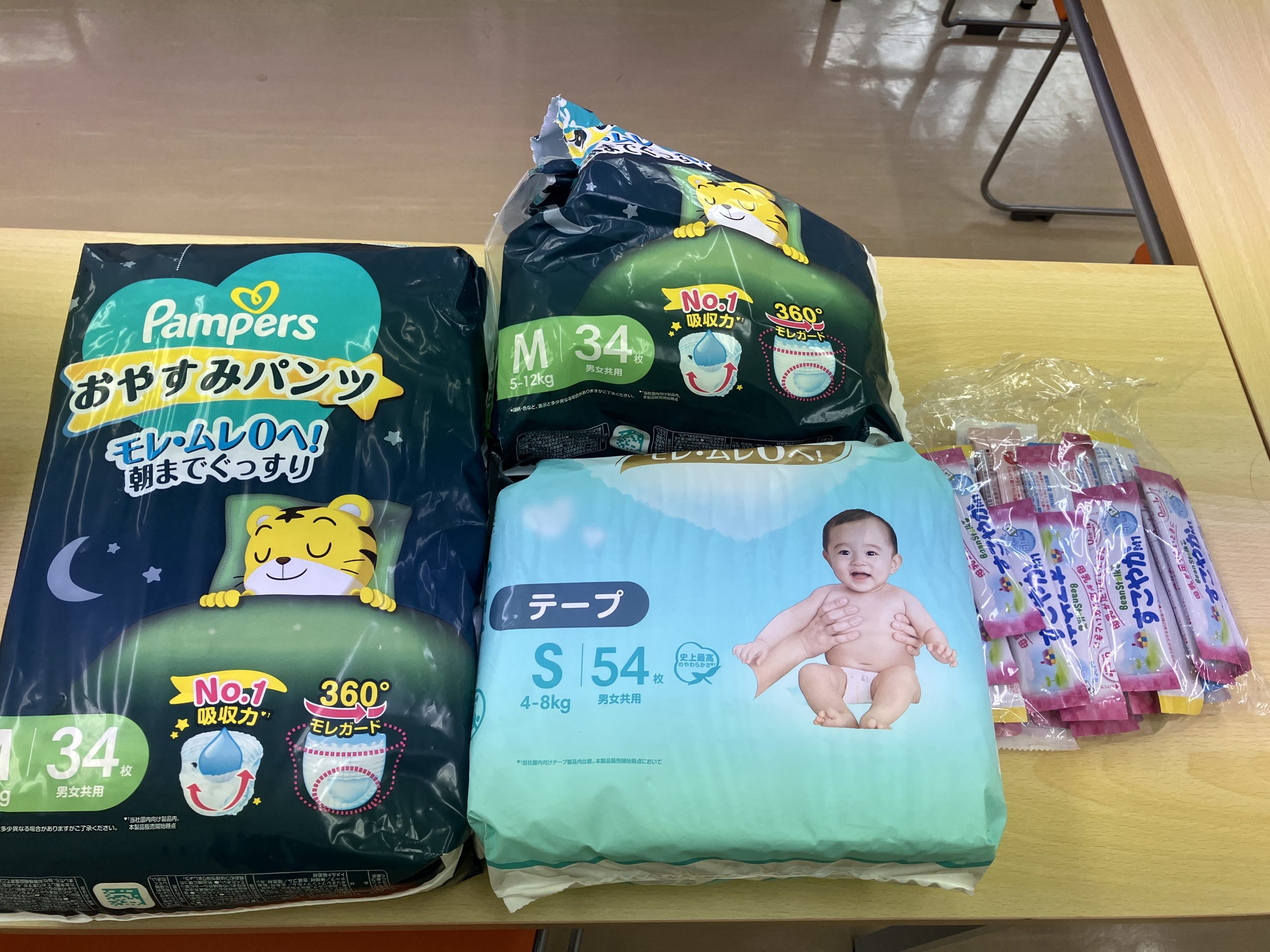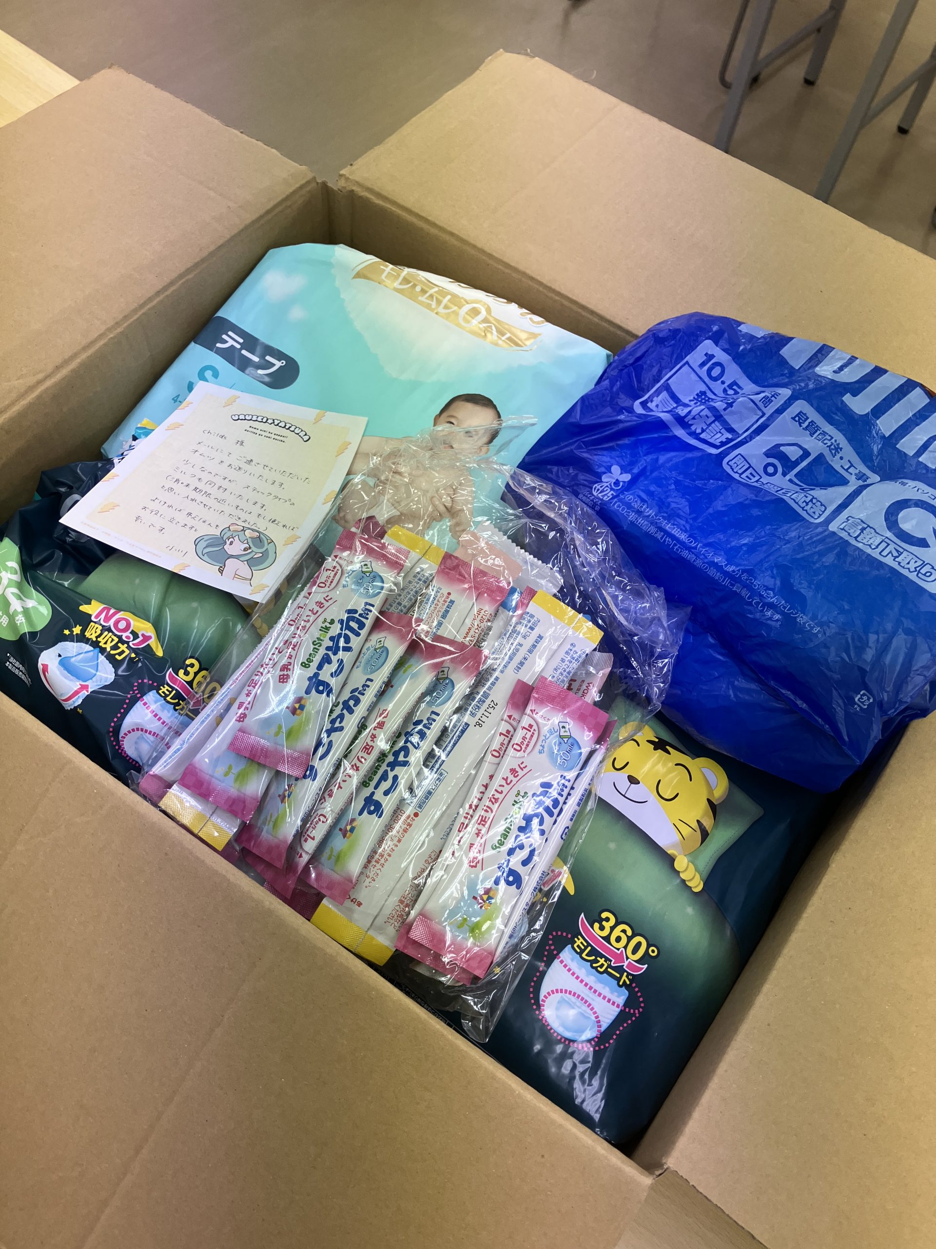 「オムツを寄付したい」と、お問い合わせをいただいた小川様からでした。段ボールを開けてみると、オムツと粉ミルクがぎっしりと入っていました。箱いっぱいに詰められた温もりと、遠く離れた東京から大分まで届けてくださった想いに胸が熱くなりました。
