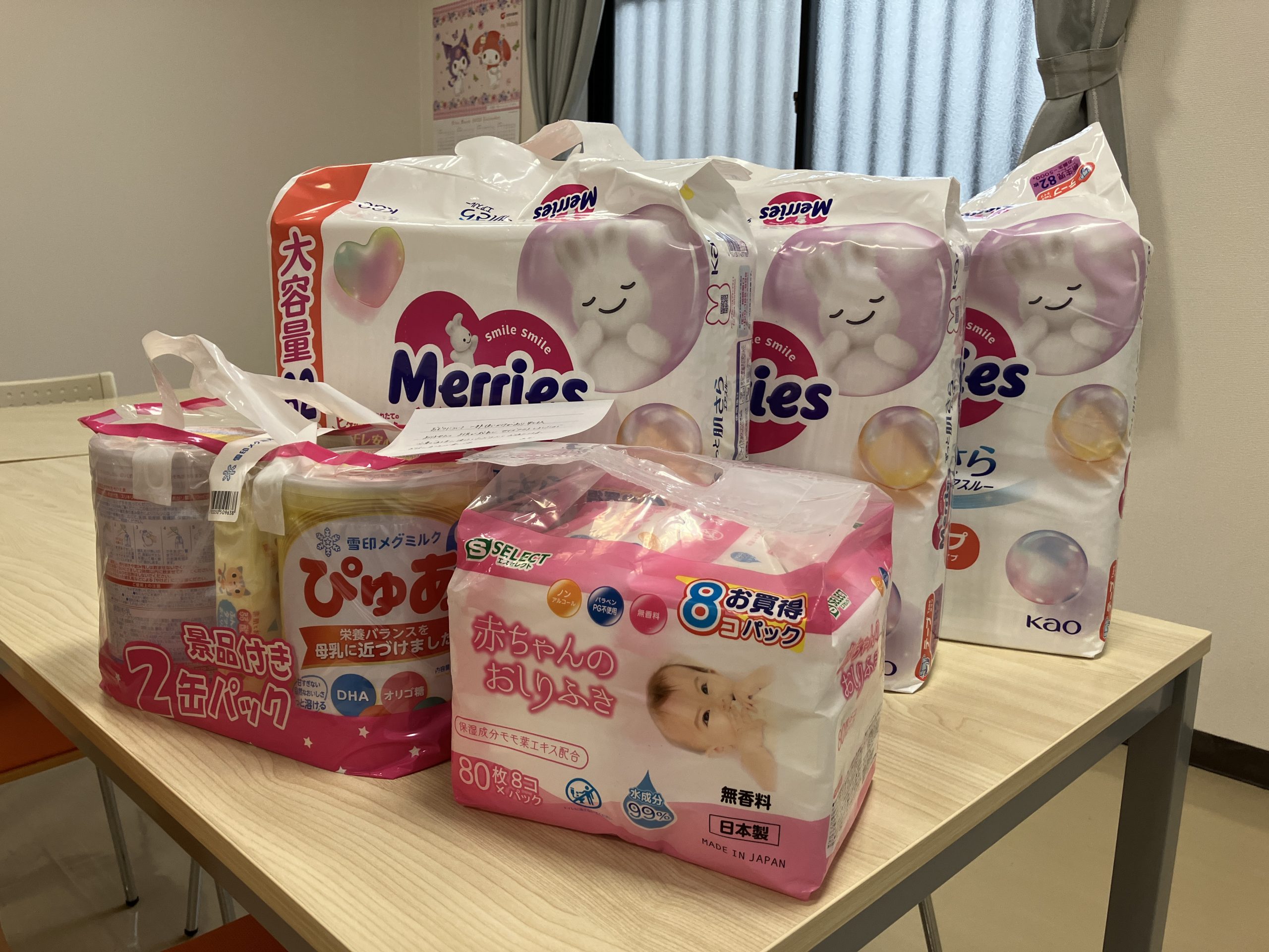 大阪府にお住いの西野様より、オムツや粉ミルク、おしりふきなどのご寄付をいただきました。